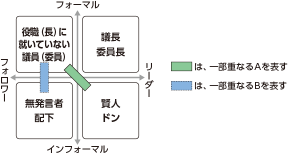 リーダーは「フォーマルなリーダー」と「インフォーマルなリーダー」に分けられ、フォロワーも「フォーマルなフォロワー」と「インフォーマルなフォロワー」に分けられます(図参照)。このことは、自治体議会においても当てはまります。