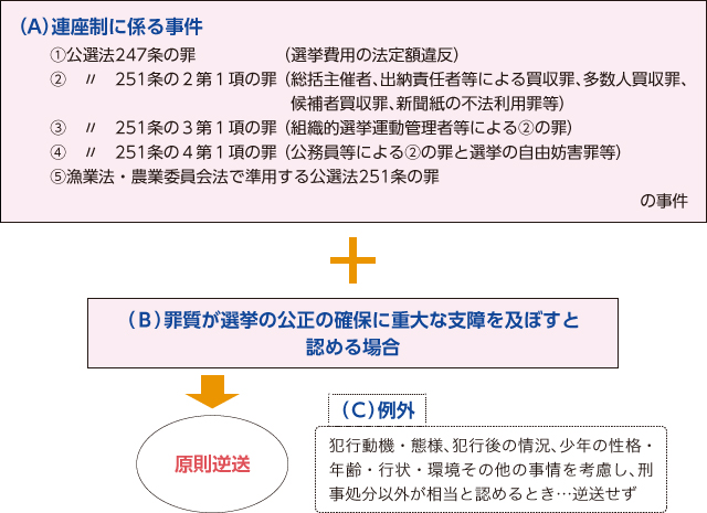 連座制に係る事件は当選人の効力にまで影響が及ぶ点で選挙制度の根幹に関わる重大な問題であることから、家庭裁判所は、当分の間、18歳以上20歳未満の者が犯した連座制の対象となる選挙犯罪の事件(以下「連座制に係る事件」という)について、その罪質が選挙の公正確保に重大な支障を及ぼすと認める場合には、少年法20条1項の検察官送致の決定をしなければならないこととするとともに、犯行の動機、態様等の事情を考慮し、刑事処分以外の措置を相当と認めるときは、この限りでないこととした(附則5条1項)(図2参照)。