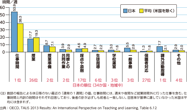 日本の仕事時間の内訳を調査対象国の平均とともに示しているが、日本の場合、授業、採点や添削、保護者対応の3つ以外は、全て平均より多くなっている。特に、学校運営、一般事務、課外活動指導で平均を大きく上回っている。こうした活動に時間をとられて授業など生徒の教育に直接当たる時間が少なくなってしまっていることがよく分かる。もっとも、授業時間が少ない割に、PISA(OECD学習到達度調査)の結果は上位を維持しているのであるから、効率的・効果的な授業が行われているともいえる。