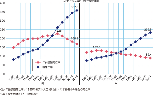 しかし、これは、そもそもがんの死亡率が高い高齢者の人口割合が増えているためであり、高齢化による影響が大きい。1年間における人口10万人当たりの死亡率を「粗死亡率」という。これに対して、もし日本人の年齢構成が不変であったら死亡率はどういう値であるかを計算した指標を「年齢調整死亡率」と呼ぶ。後者を5年おきにたどると、がんの死亡率は、男性では1995年をピークに低下、女性ではなんと1960年以降、低下し続けていることが分かる。すなわち同じ年齢であれば、がんで死ぬ確率は低下してきているのである。