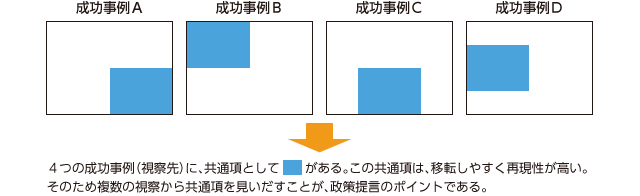 また、1回の視察だけの知見で、執行機関に政策提言をするのは心もとない。できればあるテーマの下、複数の視察を実施し、その中から共通項を抽出した方がよい。複数の視察に共通して見られる要素は、それだけ再現性が高いということになる(図2)。こういった共通項は、自分たちが所属している自治体にも移転しやすいということである。視察のひとつの方向性として、具体的事例の積み重ねから一般性を導き出すことがある。こういった観点からも視察は数か所行った方がよいだろう。