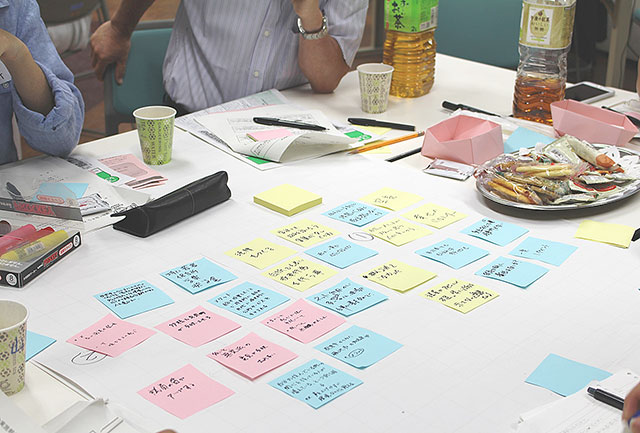 「なぜ投票率が低いのか、なぜ投票に行かないのか」、「投票率が向上することによるメリットやデメリット」、「自分と議員との関わりはどこか、自分と市政の関わり」、「投票率を上げるにはどうすればよいか」の4つのテーマごとにテーブルのメンバーをシャッフルし、意見を書いた付箋を仕分けて模造紙に貼り、テーブルごとに発表してもらった。それをファシリテーターの牧瀬先生にまとめていただき、最後には参加者全員で記念撮影を行って午前の部が閉会となり、午後の部も同様の方法で意見交換が行われた。