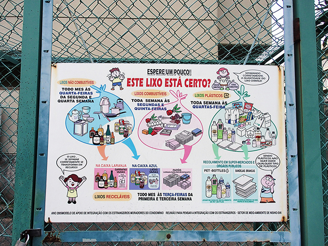 緑町団地の敷地内に中学生らしき子どもが数人、何をするでもなくたたずんでいた。肌の色や目鼻立ちなどから、一見して外国籍の子どもたちと分かった。道路側に設置された団地のごみ収集場の掲示板をみると、ごみ出しのルールなどが日本語だけでなく、外国語でも表記されていた。ほかにもいろいろな案内板が団地内に設置されていたが、いずれも日本語だけでなくポルトガル語、英語、中国語での記載も加えられている。