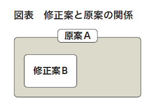 原案と修正案の関係は図表のようになります。修正案は議案の一部を手直ししたものですから、修正案B は原案Aの上にツギを当てたような感じです。そして、表決では、図表の各領域について一度ずつ判断し(一事不再議の原則といいます)、最終的に全ての領域をカバーするように順序を考えるのがポイントです。