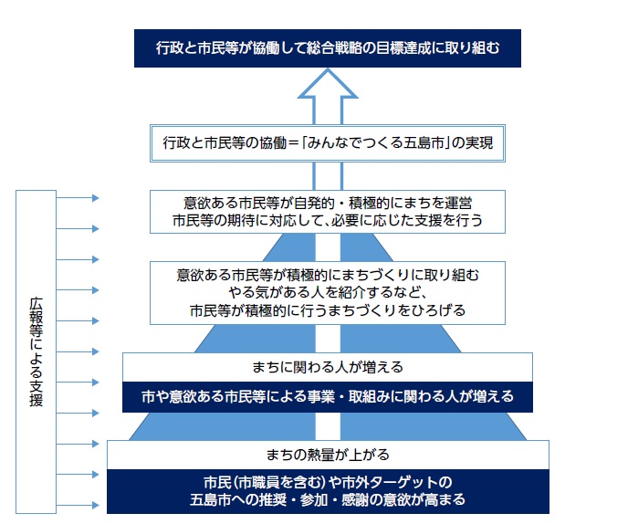 五島市PR指針は、行政の見える化を前提に、五島市のイメージの確立や情報の受発信体制の整備などに取り組み、戦略的な情報発信や市民等との効率的な意思疎通を可能とするための方策を示したものである。これらの方策を実行することで、市民や市外ターゲットの五島市への愛着・推奨意欲を高め、五島市への参画人口を増やし、オール五島市で結集してまちづくりに取り組む基盤をつくることを目的としている。PR指針は、五島市まち・ひと・しごと創生総合戦略に掲げる目標人口の達成、基本目標ごとの数値目標の達成を支援するものという位置付けである。