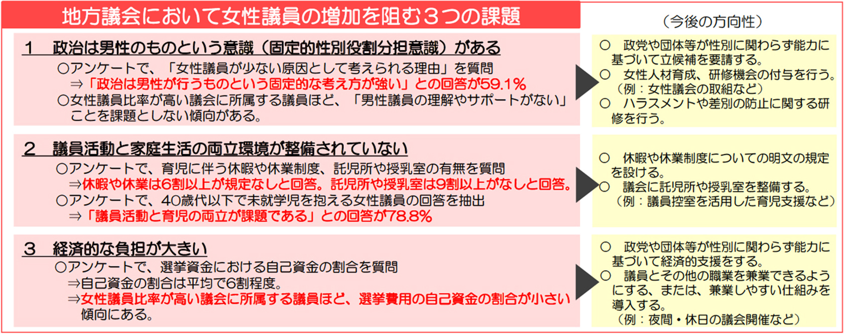候補者男女均等法制定に際して、その素材となった調査報告書では、地方議会において女性議員の増加を阻む三つの課題と「今後の方向性」が明記されている。具体的な「今後の方向性」については本稿と重なるが、本稿では社会規範、組織規範、選挙制度を踏まえて、議会が取り組むべき課題を提起している。