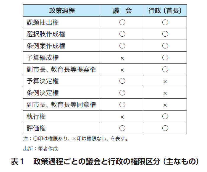 はじめに、自治体議会・自治体議員の権限を問うてみよう。政策の実施について、自治体においては行政が行うのであるから議会としては関与できないという見方があるかもしれない。確かに、政策の実施は行政が行う。しかし、実施以外の政策過程の各段階(課題抽出・選択肢作成・決定・評価)の努力により、実質的には実施に関与しうることができる。条例や予算など重要事項を決定できるのは議会の権限である。副市長、教育長等の同意権も持つ。地方自治法96条2項により議決事件を追加することもできる。表1は、議会と行政(首長)の権限を形式的に示したものであるが、議会の持つ権限を有効に働かせることにより形式的には権限がなくとも実質的に影響力を行使することができる。そうすることで議会・議員は実態的にも行政と対等な権限を持ちうるのである。