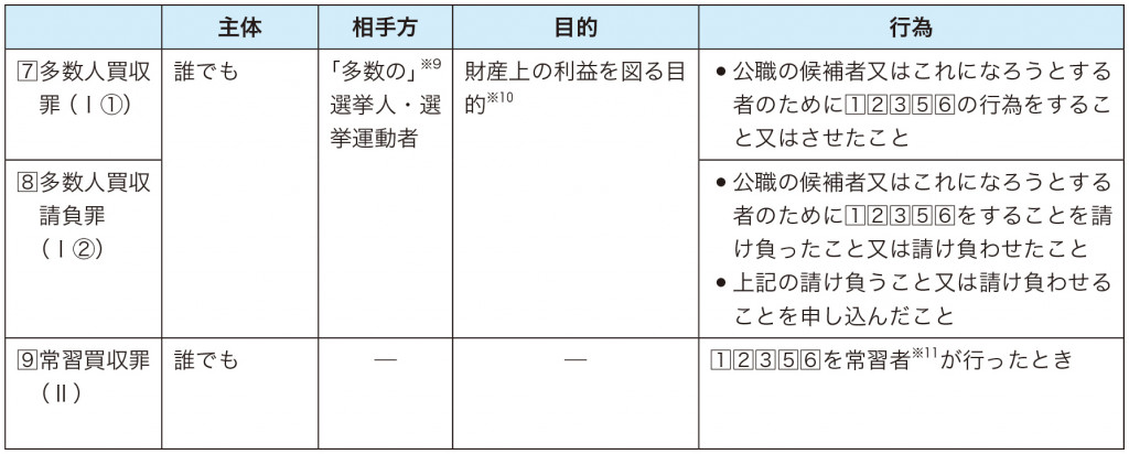 ※11 常習者というためには、反復して買収罪を行う性格・習癖があることが必要です。したがって、これまで他の選挙でも買収行為を行ってきた事実があるかどうかや、反復継続して行う蓋然性が高いかなどの要素を考慮して判断されます。しかし、一つの選挙で複数人に対し買収行為をしても、そこから直ちに常習性があることにはなりません。
