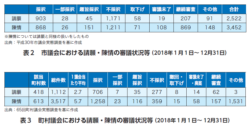自治体議会は、住民の代表機関として、請願を受理し、これについて採択・不採択の形で議会の意思を決定し、採択した請願が関係執行機関で措置することが適当と判断する場合には、これらに送付してその処理の報告を求めることができる。請願の趣旨には賛成でも、内容の一部が実現不可能である場合には、「一部採択」や「趣旨採択」とすることもある(10)。請願を採択した上で、国会や国の行政機関に対する意見書の採択・提出につなげることもある。