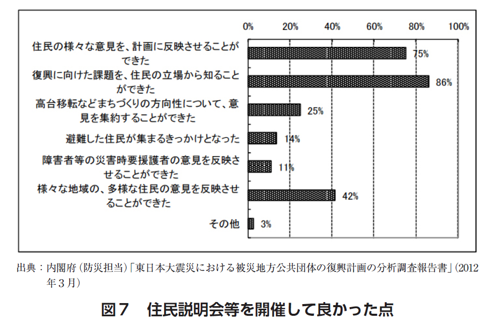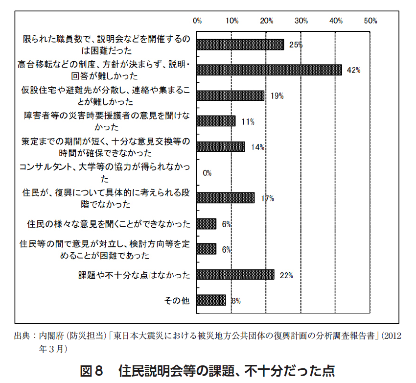 復興計画の策定に当たり、ほとんどの自治体で住民への説明会等が行われています。しかし、住民への説明に当たっても、様々な長所と短所があります。図7、図8では、「復興に向けた課題を知ることができた」という情報や意識の共有効果は認められる反面、「限られた職員数での開催は困難だった」という自治体側のスタッフ不足や準備不足を指摘する意見や、「高台移転等の制度や方針が決まらない」という迅速な意思決定を求める意見、「仮設住宅や避難先が分散し集合等が難しい」などの開催場所の利便性を求める意見などが課題として挙げられています。