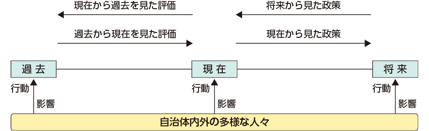 「安心・安全型政策」を考えるには、「現在」から「将来」のことを考える「現在から見た政策」だけではなく、目標時点である「将来」から遡り「現在」まで段階的に目標を立てる「将来から見た政策」も必要である。つまり「現在から見た政策」「将来から見た政策」両方の立場から見た政策が必要である。また、その政策をより適切なものとするためには、「過去」から「現在」までの歩みを振り返る「過去から現在を見た評価」と、「現在」から「過去」に段階的に遡る「現在から過去を見た評価」を行うことが求められる(図2参照)。そうすることにより、図3~5に示すように、見えにくい課題、見えにくい時代潮流、見えにくい地域特徴、が可視化されることになる。これらが可視化されなければ、適切な政策過程は成立しない。なお、いつの時代においても、自治体内外の多様な人々の行動が自治体や社会に広く影響を与えている(図2参照)。