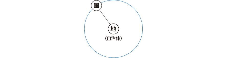 地元自治体を第二段階の自治体(地元市区町村)に位置付ける場合、その世界は異なって見える。地元自治体(=市区町村)の周辺に都道府県が配置される。そして、その都道府県のさらに周りを、国が周回することになる。市区町村と都道府県の距離に比べて、都道府県と国の距離がはるかに大きければ、実質的には、市区町村と都道府県が一体となって、その周辺を国が巡ることになる(図7)。太陽から見れば、地球も月も、ほぼ同じような距離に常に存在する。市区町村から見た国のあり方と、都道府県から見た国のあり方は、ほとんど同じになる。