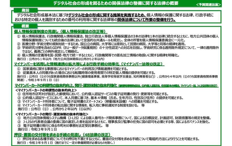 この整備法案は、衆議院においては、27時間25分の審議を経て令和3年4月6日に、また、参議院においては、24時間50分の審議を経て5月12日に、それぞれ政府案のとおり可決され、同月19日、「デジタル社会の形成を図るための関係法律の整備に関する法律」(令和3年法律第37号。以下「整備法」という)として公布された。