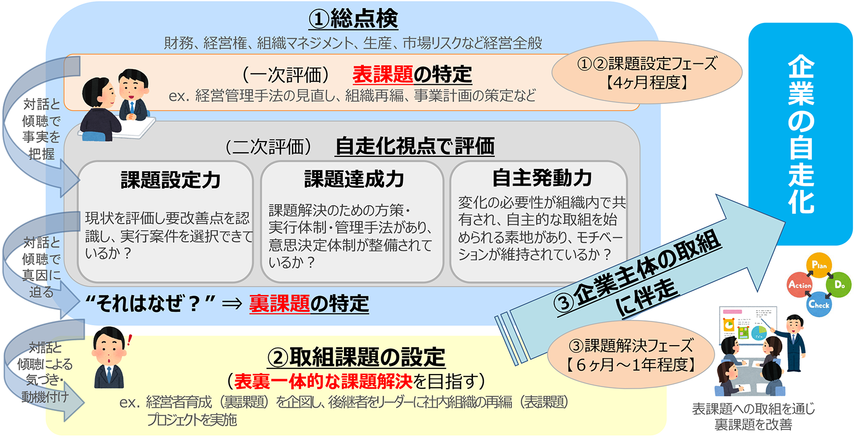 まず、「①総点検」では支援先企業の経営・生産・組織全般について、社長はもとより、社員各層をヒアリングすることで会社の置かれた状況を客観的にとらえ、そこから浮かび上がった課題をすべて経営者に提示する。