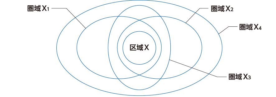 広域性が、実質的には圏域性として理解されるのは、広域性が区域Xを超えるというだけならば、世界・地球・惑星や宇宙全体まで、際限なく広がりうるので、捉えどころがなくなるからである。あくまで、起点となる区域Xで展開される人間の諸活動と密接な関係において、広域性は限定して捉える必要があるからである。区域Xにとっての広域とは、圏域Xであり、無限の外界を意味するわけではない(図8)。