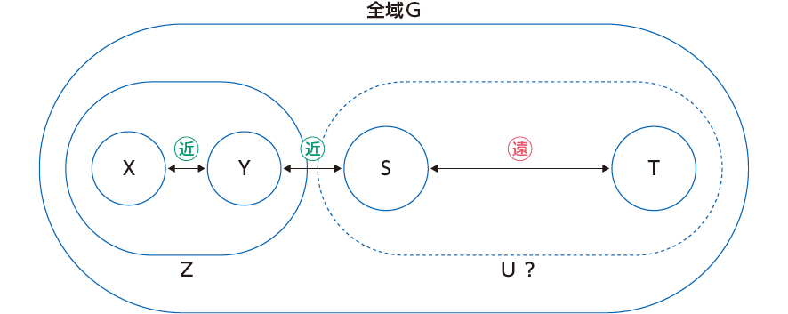 もっとも、区域Yと区域Sとの距離が近くても、広域の区域Z(の境界)のあり方によっては、YとSの両者がZに包含されるとは限らない。特に、区域Zの周辺部にある区域Yの場合には、区域Zに含まれない区域Sとの間で近傍性又は隣接性(近隣性)を持つことはある。さらに、遠隔にある区域Sと区域Tについては、両者間を包含する広域の区域Uは、想定しにくいといえる(図3)。あるとすれば、一国全体又は地球全体の区域(全域G)となる。