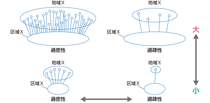 自治体にとっての実効的な区域面積は、客観的な平方キロメートルで表現される問題ではない。むしろ、基準となる区域Xを縁として展開される人間の諸活動、つまり、地域Xの規模やその膨張/収縮との相対関係である。地域Xに対して、区域Xが小さすぎる状態が過密性であり、区域Xが大きすぎる状態が過疎性と呼ぶこともできよう(図5)。