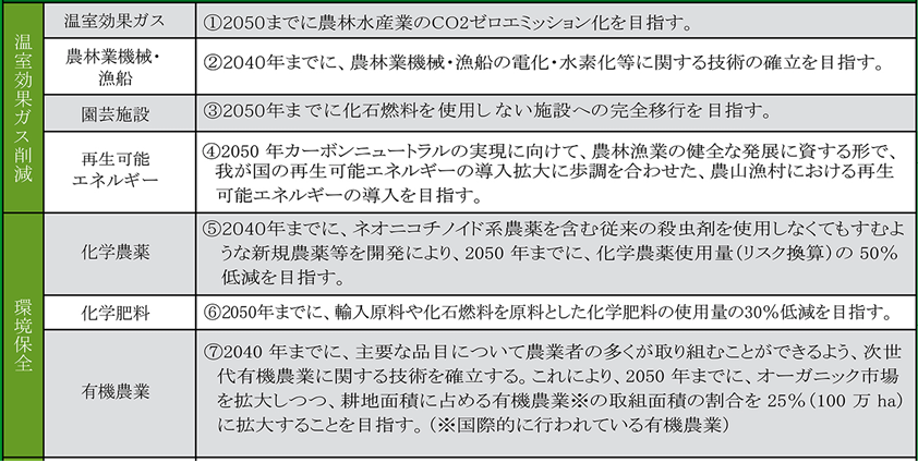 「温室効果ガス削減」や「環境保全」のために重点的に取り組むべき項目と、それぞれの具体的な目標数値を掲げている(表)。これ以外にも、「林野・水産」、「食品産業」の目標設定がなされている。