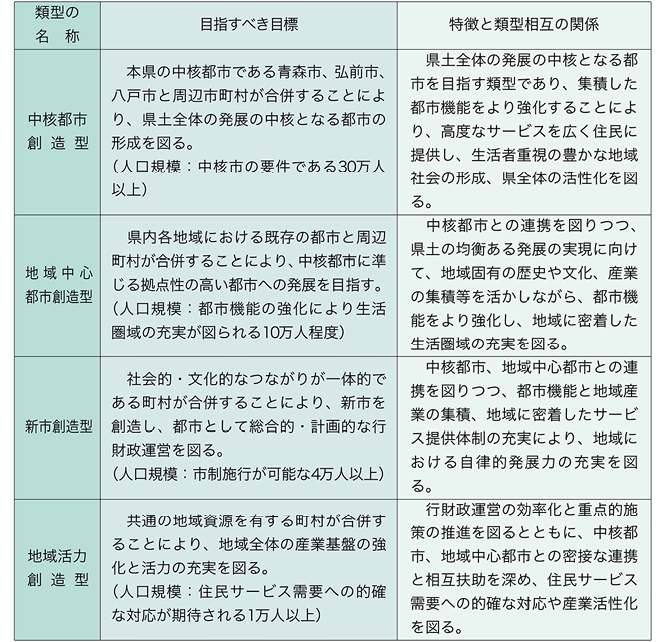 合併パターンの作成では、県土の均衡ある発展と地域の自律的発展力の充実を図るため、20~30年先の中長期的な視点に立って、次の項目を総合的に勘案したという。具体的には、①地域の結びつきを示す生活圏の指標(通勤圏、通学圏、商圏、通院圏)及び行政圏の指標(郡の区域、高等学校学区、一部事務組合(消防、ごみ処理)の区域、広域市町村圏、保健所所管区域、警察署管轄区域)の統計的分析の結果、②県民、各種団体(代表者)、市町村長、市町村議会議員に対するアンケート調査結果、③市町村長インタビュー結果、④市町村合併に向けた地域の自主的な動きなどである。とはいえ、この合併パターンは地域における議論の「たたき台」として提供したという。市町村合併の組合せは、地域の合併に対する気運や熟度に応じて変わるため、この組合せ以外の組合せもあり得るとしていた。
