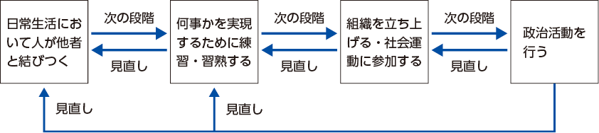 このことについて宇野は、アレクシ・ド・トクヴィルが、人と人が結びつくのは技術だといっていることを紹介しています。そして、日常生活において人が他者と結びつき、他者とともに何事かを実現するためには練習が必要であり、日々の目的で組織をつくることに習熟してようやく、政治的な主張を行うための組織をつくったり、社会運動に参加したりすることも可能になるといっています(宇野 2022:139)。また、まずは自分の属するコミュニティでやってみる。小さな実験を積み重ねることが大切であるとしています(宇野 2022:140)。さらに、民主主義も、完璧に準備してから行動するのでは時間がかかってしまうので、とりあえずやってみて、結果を見て修正すべき点を修正するというプラグマティズムは有効なやり方だと述べています(宇野 2022:142)。