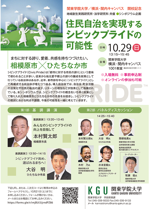 2023年10月29日に、筆者の所属する関東学院大学において「住民自治を実現するシビックプライドの可能性」というテーマでシンポジウムを開催しました(写真1)。同シンポジウムは、本村賢太郎・相模原市長、大谷明・ひたちなか市長をお招きし、シビックプライドの現状における具体的取組みや利点等を講演していただきました。
