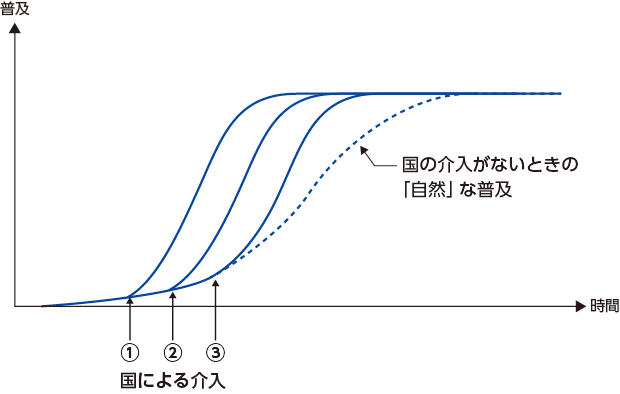 新規の政策・制度Xが、100%の自治体で普及するとすれば、多くの場合には、国による権力的介入が契機である。そもそも、普及自体が急速に進む契機は、国による「お墨付き」であることも多い。自治体としては、他の自治体の政策・制度を参照しようにも、その是非・当否・真贋(しんがん)を見極める能力と自信がないことがある。そのときに、国が信用供与というかたちで、新しい政策・制度に裏書きをしてくれれば、多くの自治体は他力本願的(非自治的)に安心できる。このような国の介入は、法的権限に基づく強制ではないが、情報や知的権威という資源と、自治体の依存心や他治性・被治性を利用した権力的介入である。国の「お墨付き」が早ければ、普及曲線は早くに立ち上がり、遅ければ普及曲線はなだらかな上昇にとどまる(図2)。