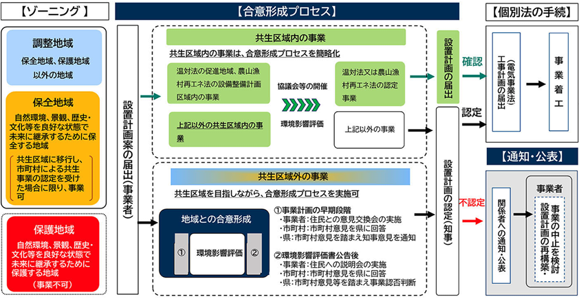 共生条例は、次の二つの手法を組み合わせることにより、現在の世代が未来の世代に引き継ぐべき自然環境等を保全することを前提に、持続可能な形で本県における再生可能エネルギーの円滑な導入を促進するものです。