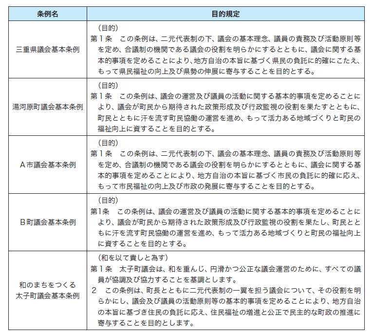 ここまで読んで、読者は「和のまちをつくる太子町議会基本条例の類似性は何パーセントか」と気にするかもしれない。それは内緒にするが、同条例の1条の見出しは「和を以て貴しと為す」である(表)。多くの議会基本条例の1条は「目的」と記しているが、太子町議会は違う。この点が(遠回しになるが)回答である。