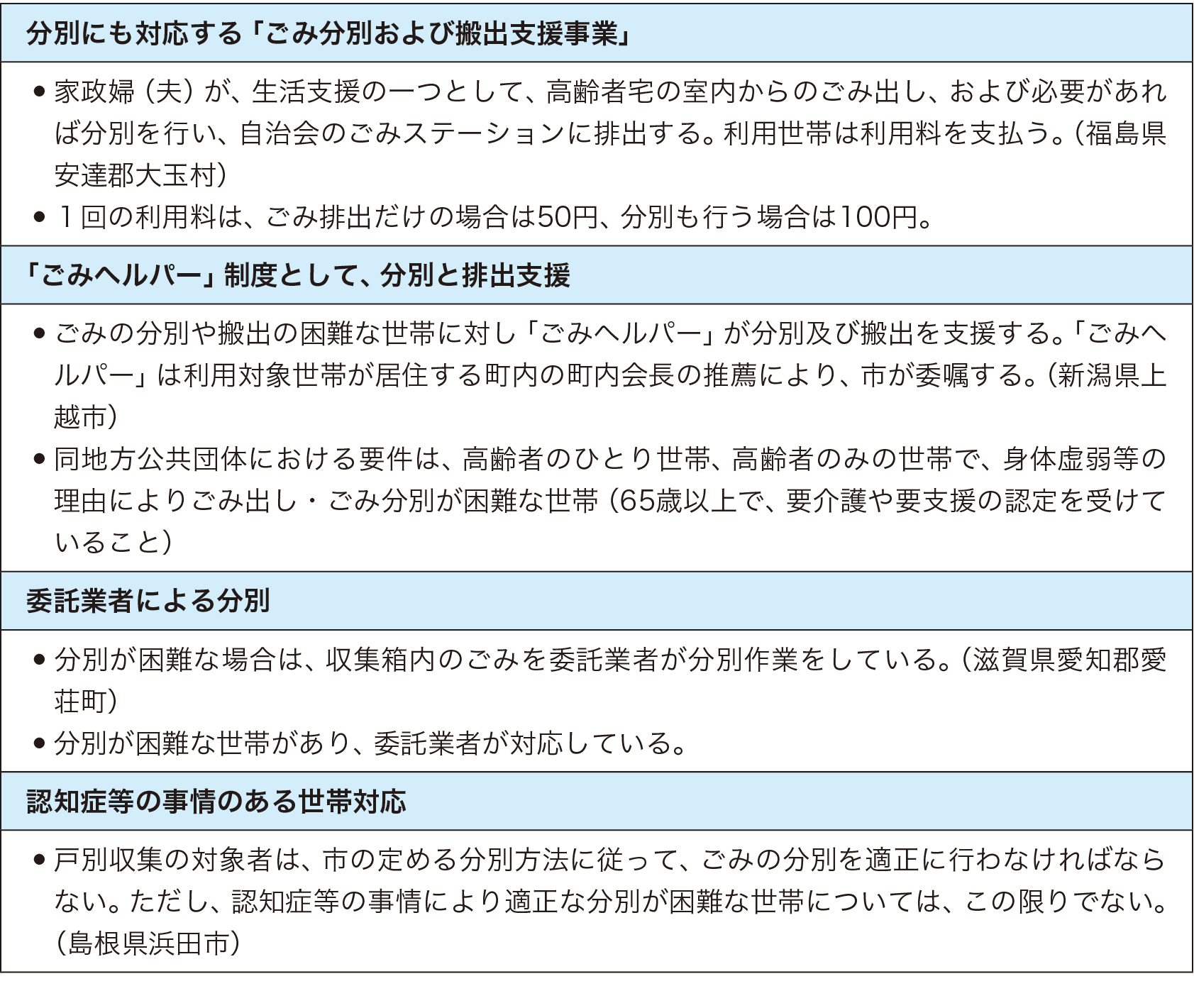 障害や認知症、加齢などのためにごみの分別が難しくなった地域住民に対して、自治体独自の支援事業を行っているところは多くはないようです。